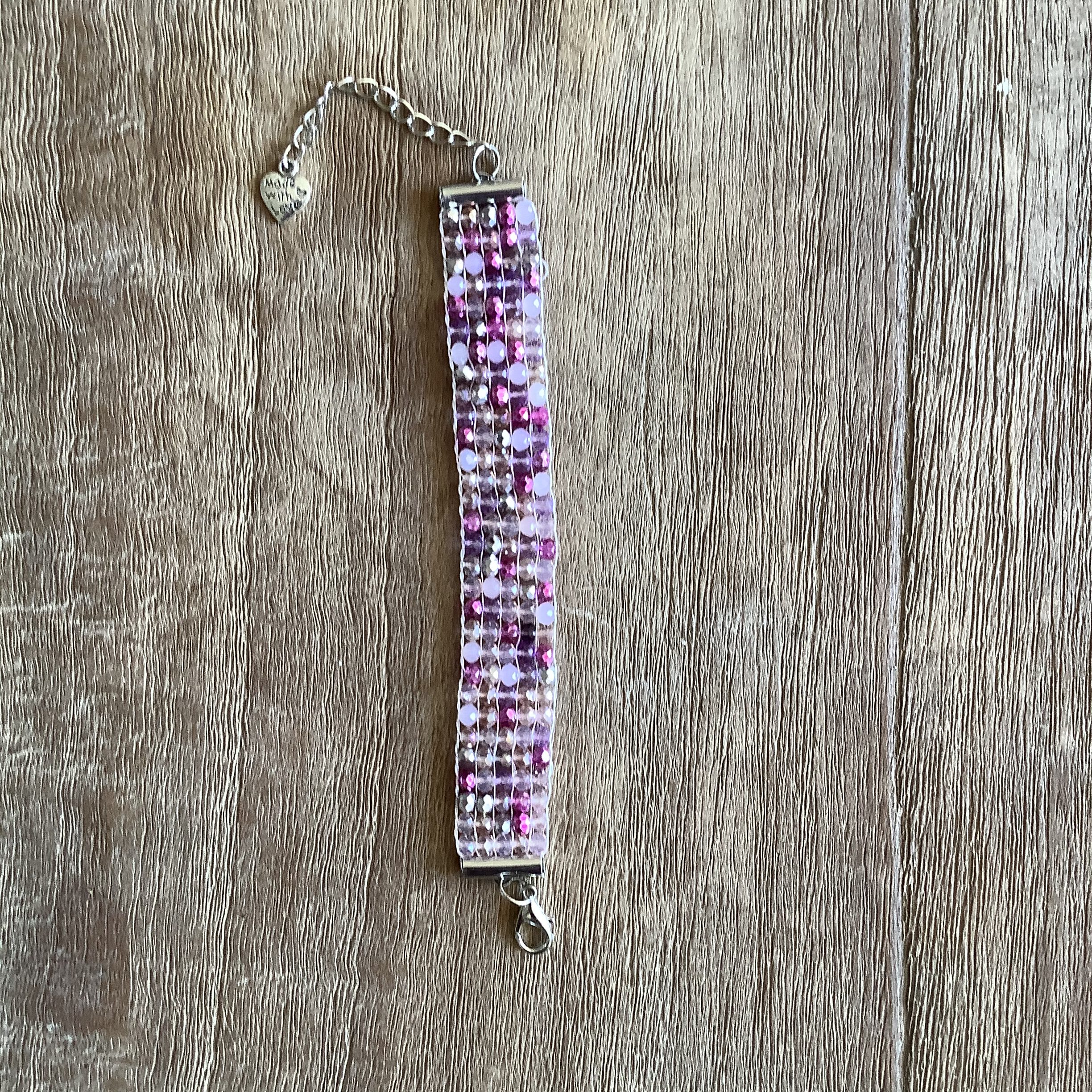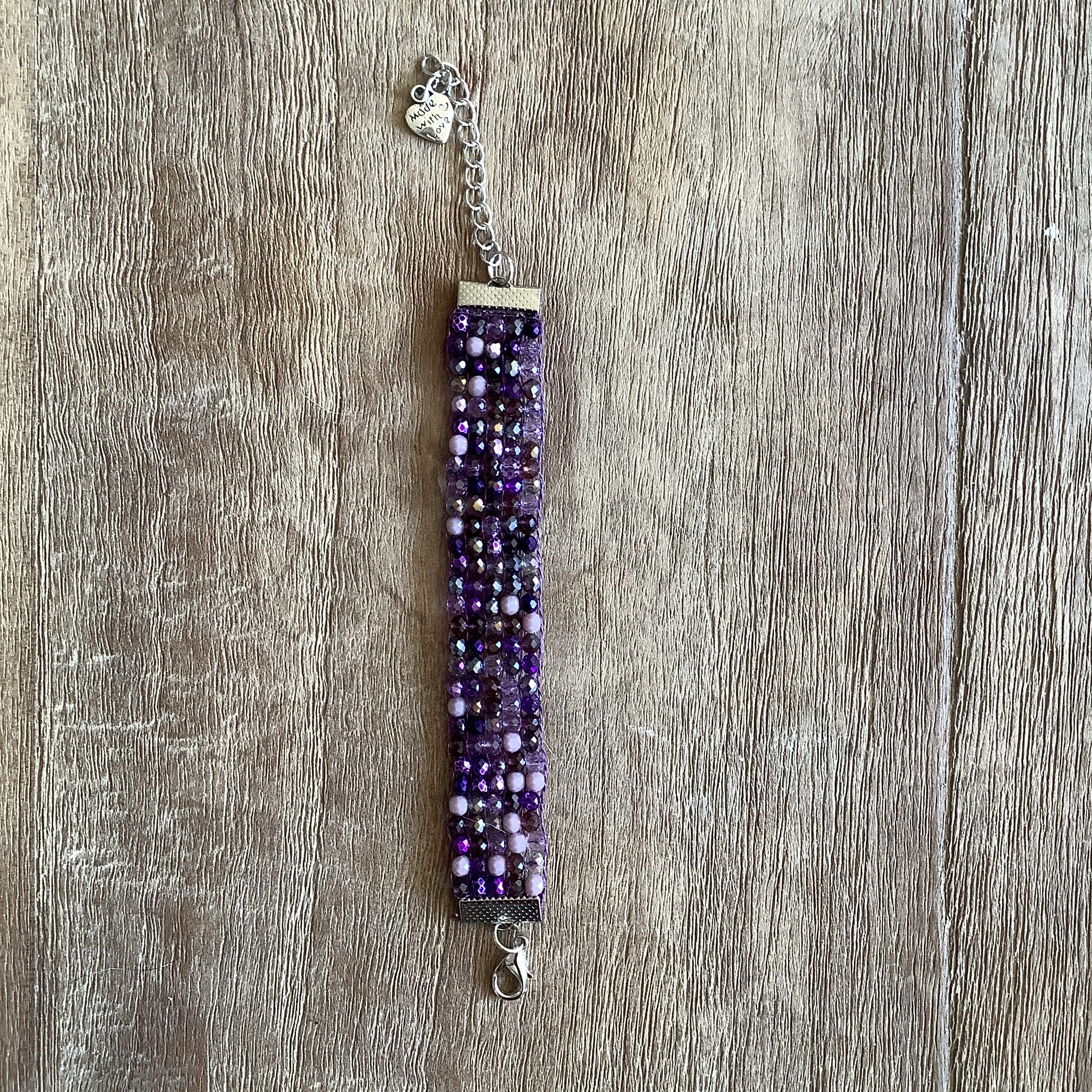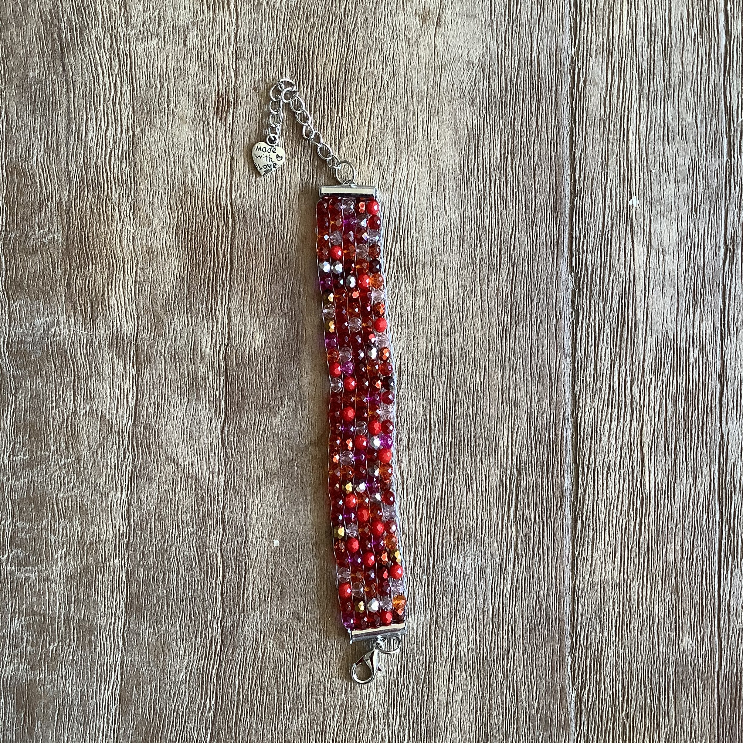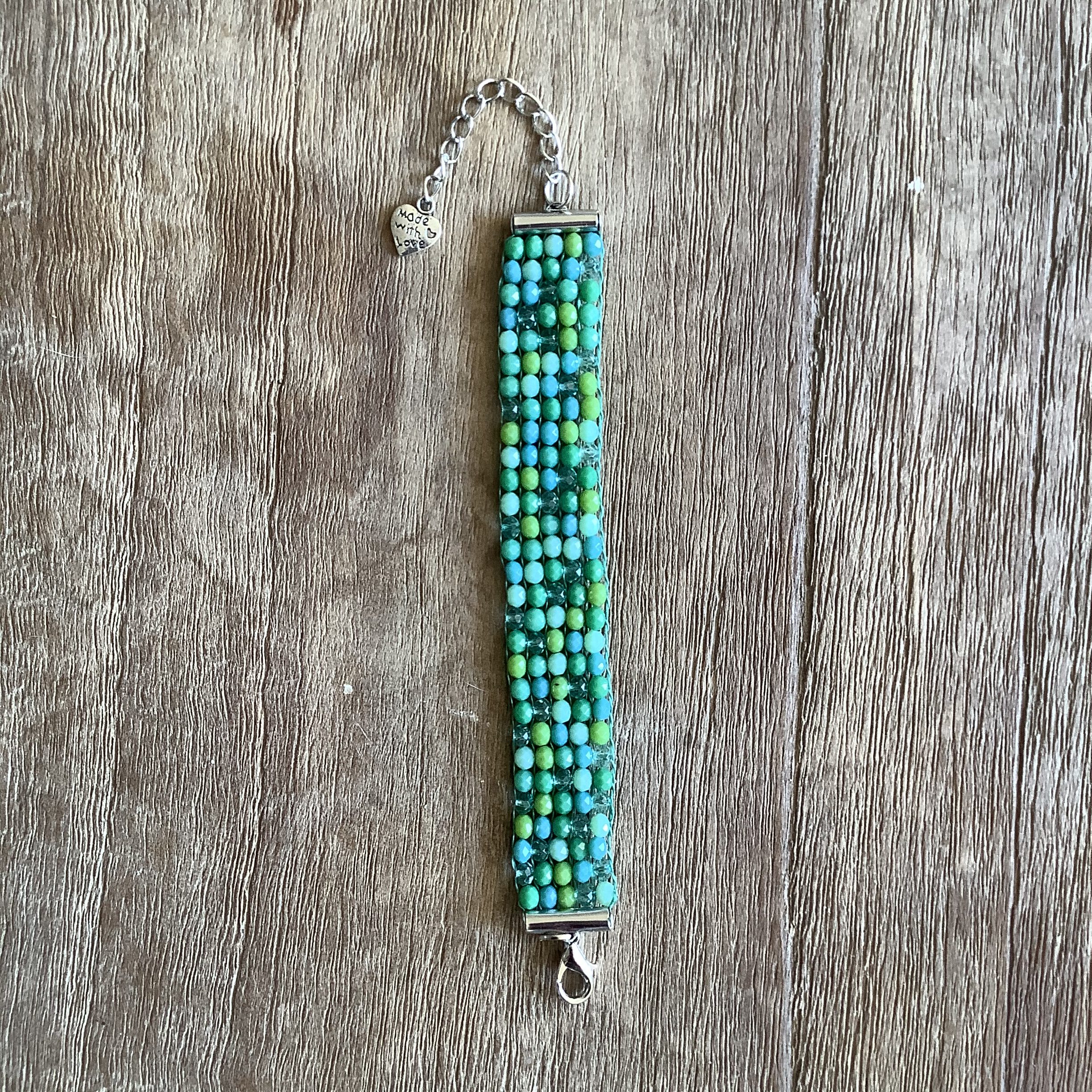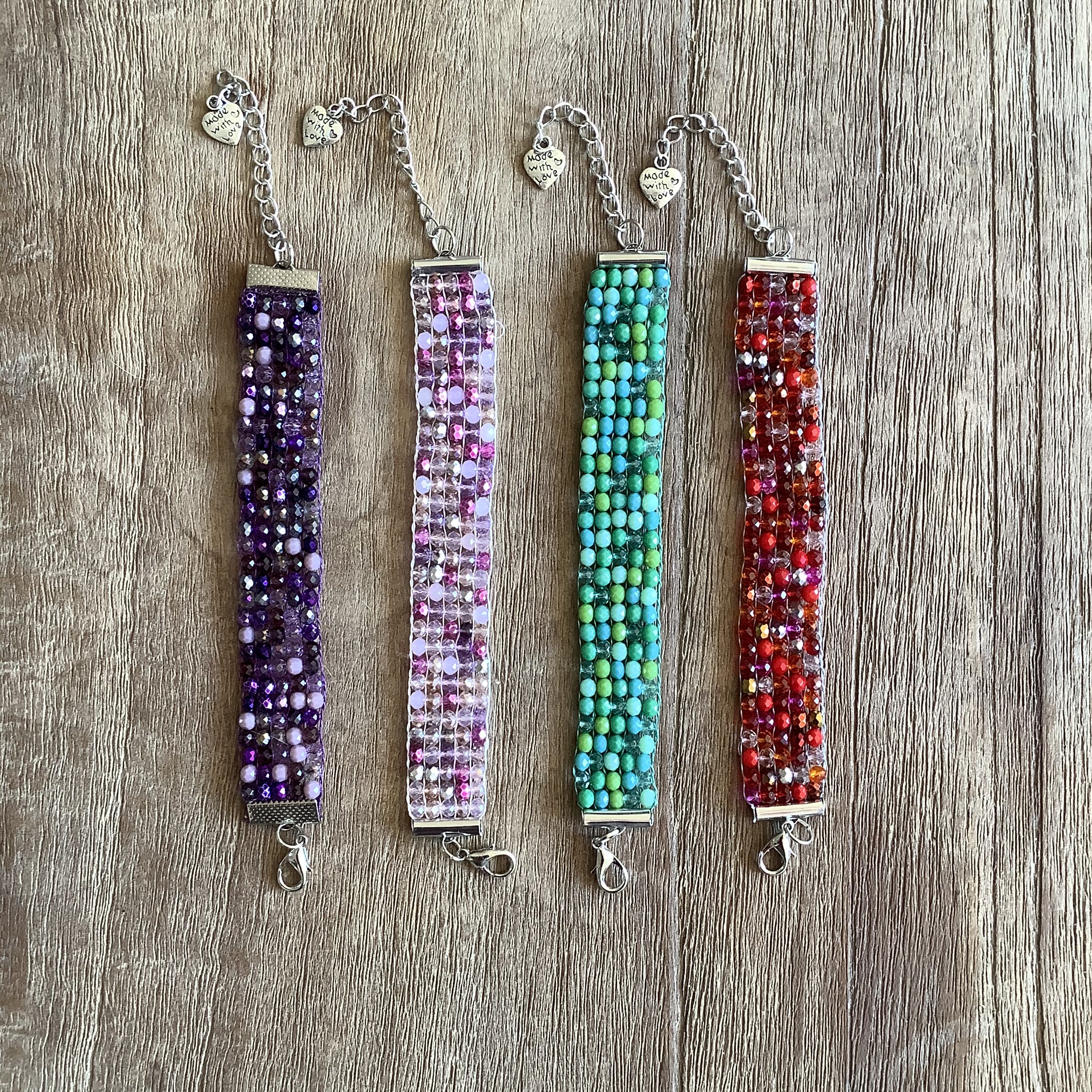 Geweven armbandje met verschillende kleuren facetkralen.