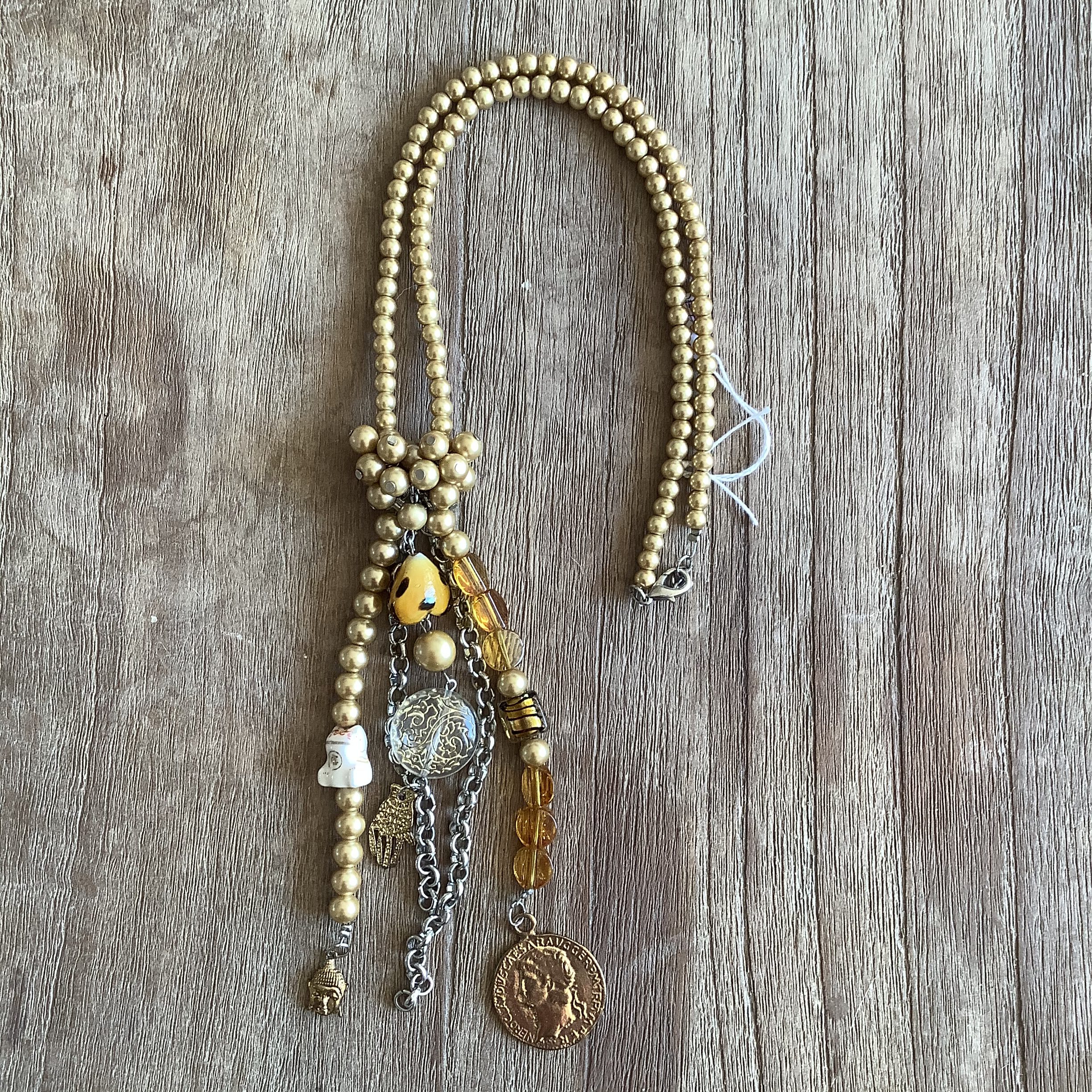 Lange ketting van goudkleurige glasparels met een boeddhistisch thema.